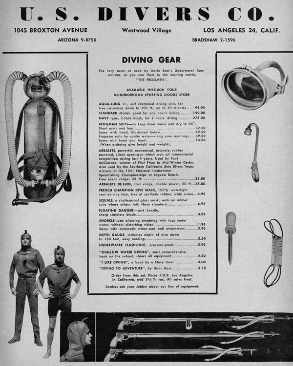 Due to rapid growth, he moved his manufacturing operation to Los Angeles and hired a sales manager. At this time, a buyer could purchase a tank, a valve and a regulator for $140 and US Divers was basically the only show in the country.