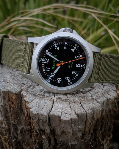 H.Goose is based right here in South Carolina and not only produces this watch, but also a diver. Other products include several rugged field jackets, a really nice vintage-inspired sporting blanket and a line of beautiful canvas and leather bags. Recently, they also added some T-shirts and polos.