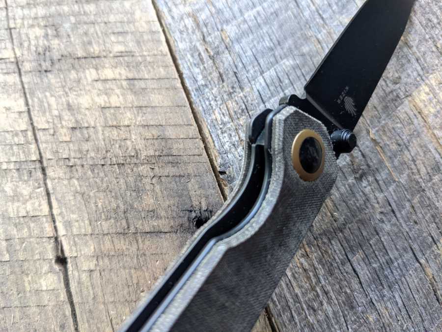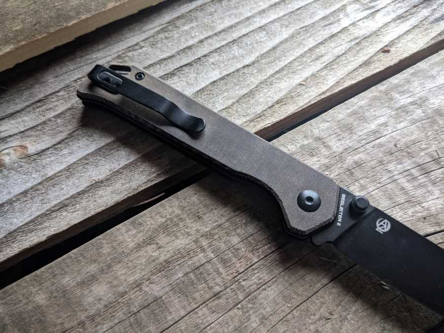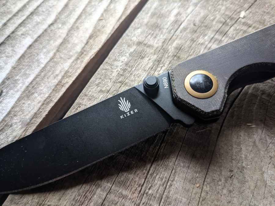 The particular model I’m basing this review on is the Kizer Begleiter 2 with a N690 stainless steel blade and gray micarta handle. The handle has a deep carry pocket clip, and the blade steel has a black titanium coating.
