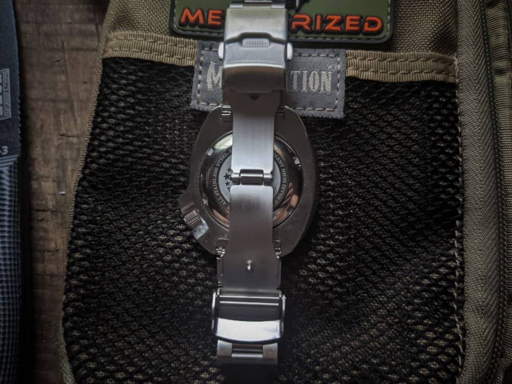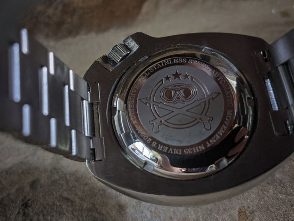 In the back is a stainless steel, screw down caseback that is engraved with the ADDIESDIVE logo. It has a slight, flat bubble to it which adds a tad in the height department, but it should sit fine on the wrist and sink down a bit (it does on my wrist). One thing I wish ADDIESDIVE did was drill the lugs, it would make strap changes that much easier.