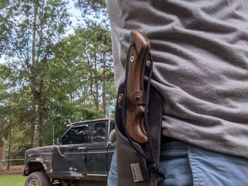 Both of my boys loved it and actually used the sharpened flat tip in multiple ways, such as cutting out roots and scraping away vines. I was impressed with the overall usability and how it performed. We chopped, sliced, hacked, and even batoned a few pieces of firewood and it never complained or showed any weakness. Under heavy use there is some slight blade flex, but nothing out of the ordinary. What surprised me the most is that the walnut scales never loosened up after all that chopping.