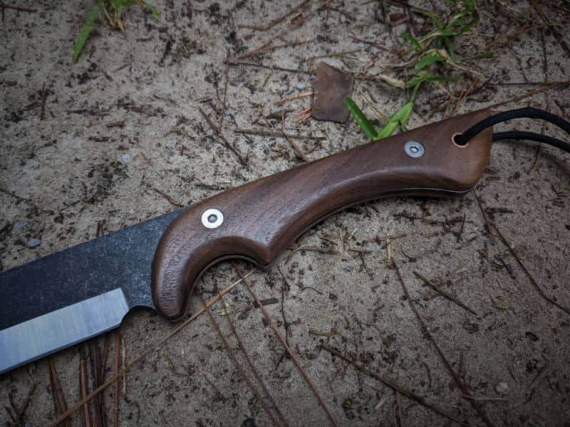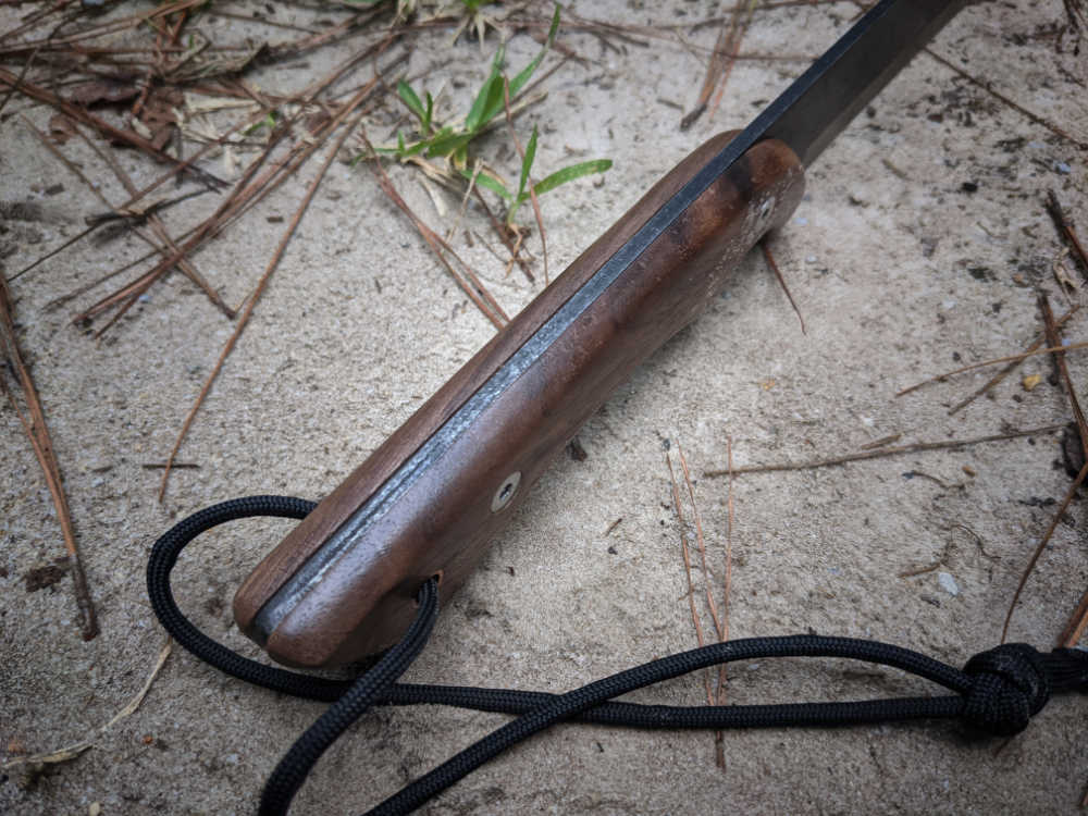 Rather than a traditional straight handle, Barebones Nata has a carved finger groove. The actual full tang handle portion of the knife is contoured and the walnut scales mimic the shape. The scales are attached with stainless steel screws and there is a copper lanyard tube at the end. This contoured handle gives you the ability to choke up for finer work or hold it loosely at the back for bigger swings.