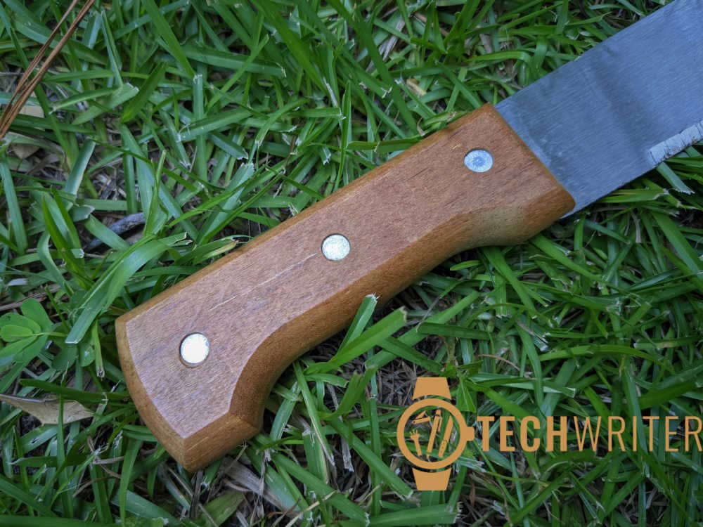I’ve read other reviews that spoke negatively about the Tramontina Machete’s handle, but I’ve found it comfortable and easy to grip despite its basic design. The wood is smooth and nicely beveled, and although there isn’t any grip texture to speak of, I find that it still holds well even in wet conditions.