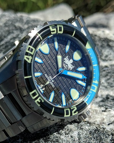 Like a lot of watch folks, I picked up some of the entry level divers to try them out. Well, one thing led to another and I had a chance to wear a few more and after two years of watch trading, you are just as likely to find a steel bracelet watch on my hand as a nylon strapped field watch. I went through the normal progression I think: an Invicata Pro, Casio Duro, Citizen Promaster and a few others. Then I picked up an Orient Mako and that was the game changer for me. I was hooked. This is not my first brush with Phoibos; I had the opportunity to pick up a PX002 Swiss Quartz Diver. I was impressed with that watch for what it was and still wear it now on a regular basis, almost two years later.
