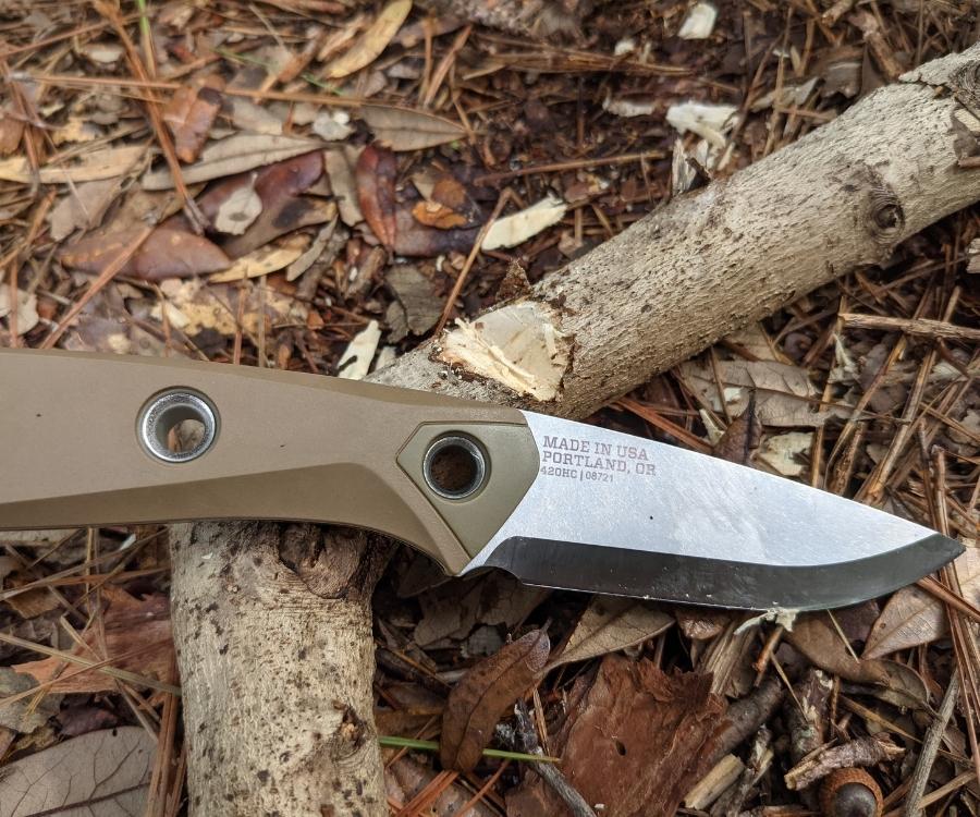 First, let’s run down the basic specs. The Principle is a full-tang fixed blade that is targeted for bushcrafters and outdoorsmen. It has a square spine for striking a ferro rod, rubber scales for the handle with large lashing holes, and a scandi grind. Overall length is 7.5” with a blade length of 3.25”. The blade steel is 420HC. I could not find any more info on their treatment or the Rockwell hardness of this guy. (420HC steel can be done well or done poorly based on the heat treating.)