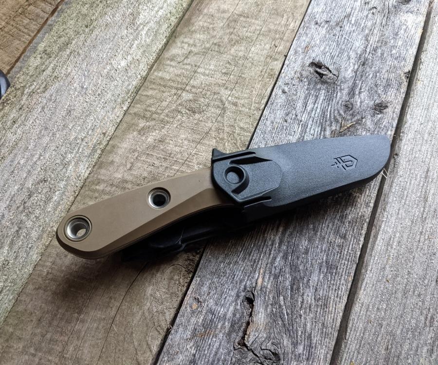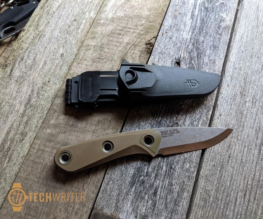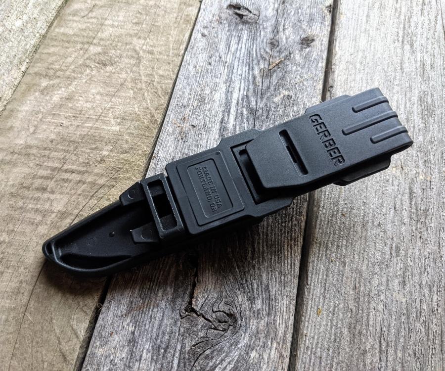 The sheath almost ruined the whole knife for me. I really think Gerber should have gone with a simple kydex or nicer leather. It maybe would have fit the vibe better. What you get is a semi-tactical plastic sheath with multiple mounting options, most of which really don’t work that well. The knife does fit snugly inside, but mounting or wearing it is a mess. I was disappointed in the sheath to say the least. Depending on how you mount the sheath or what accessories you have configured, it can be finicky to get the knife out. You have to put your thumb on a release tab that you can’t get a great hold on because of how the rear mounting block is attached to the backside of the sheath. Good thing this is a camping/bushcraft knife because you’re not going to whip it out for any tactile situations with a sheath like that.