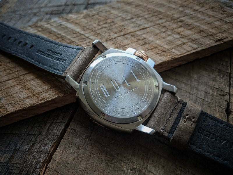 The Hull Diver has a signed, screw-down caseback. The name, along with some watch details, is engraved into the backside. The caseback is almost flush with the case and doesn’t add any undo overall height to the watch.