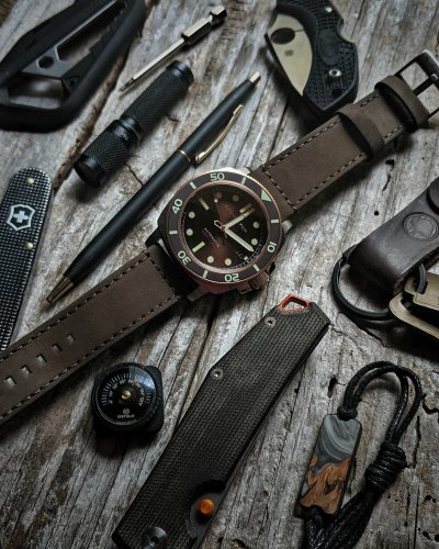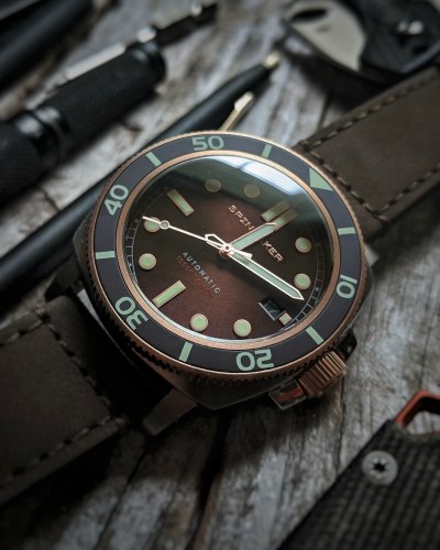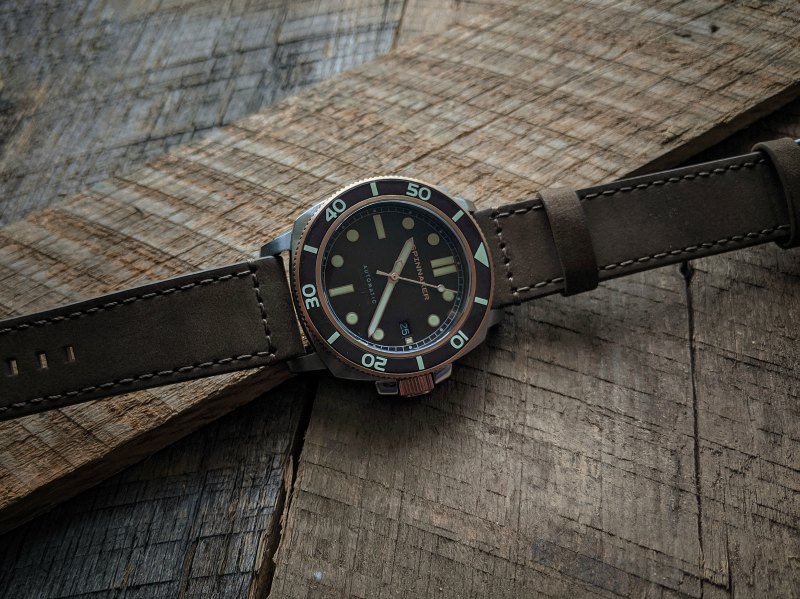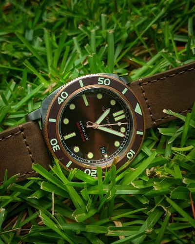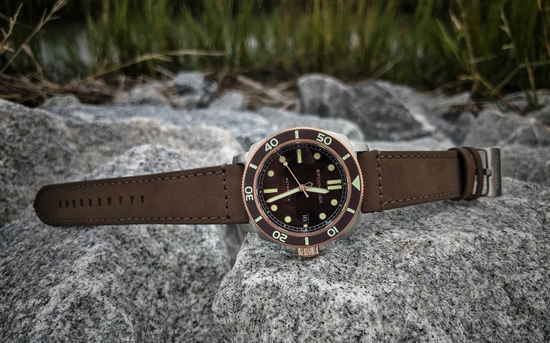 The dial is where the good looks start: the brown sunburst is a beautiful shade and the indices and hands play off the deep, rich color. Unlike many of the Spinnaker models that have a cool textured dial, they decided on the Hull Diver to go with a smooth dial with sunburst.