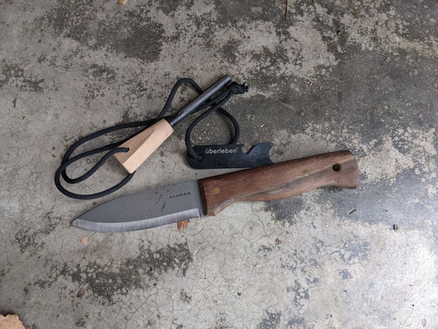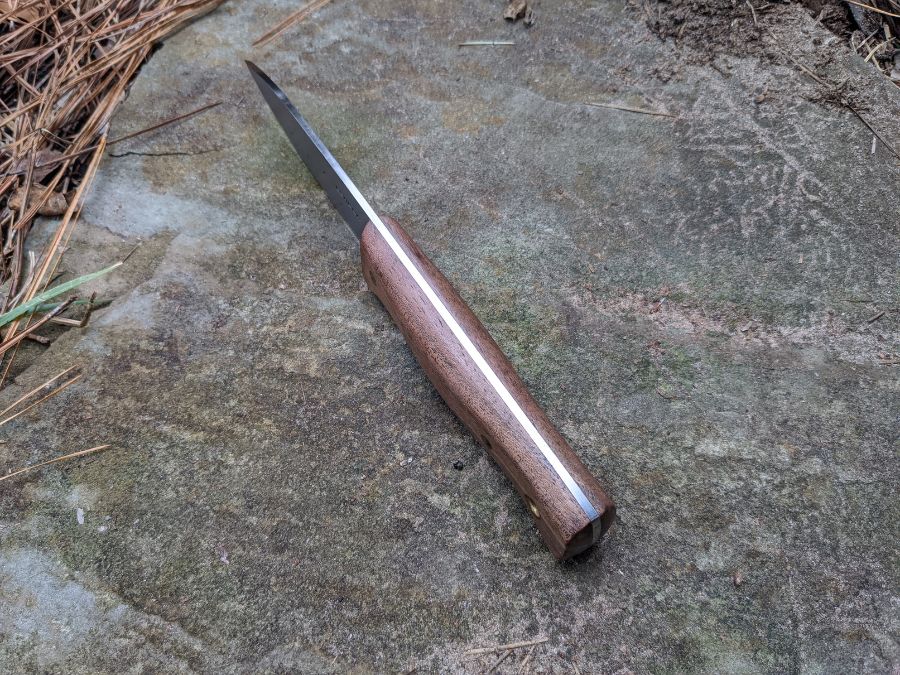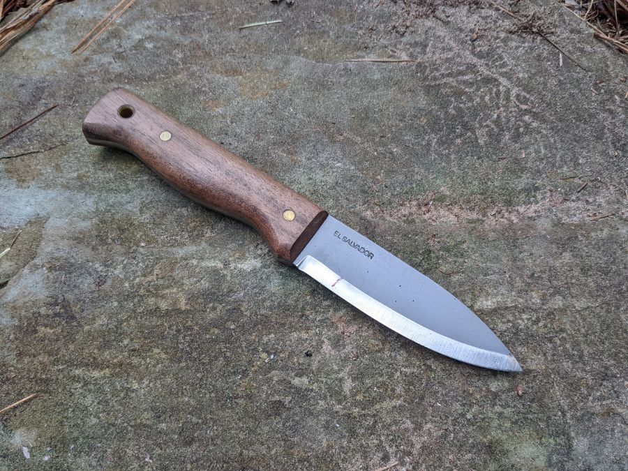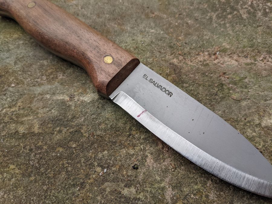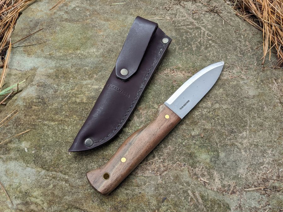 The bushlore knife is made from 1075 high-carbon steel with solid walnut handles. Like any good bushcraft blade, it has a full tang, meaning the blade steel runs the entire length of the knife.
