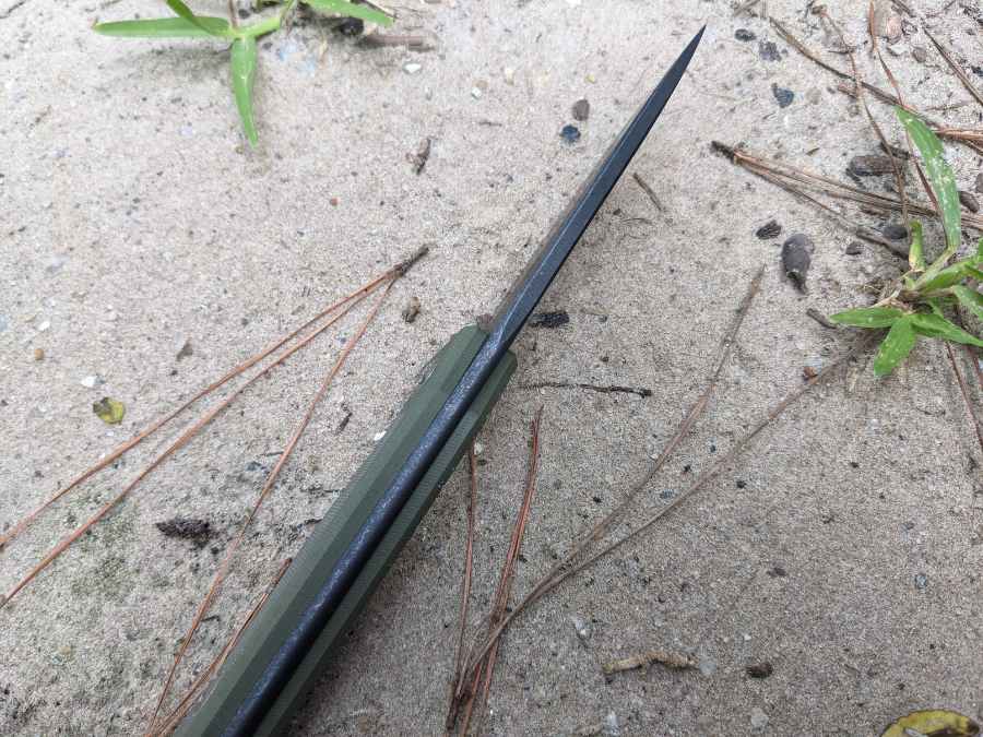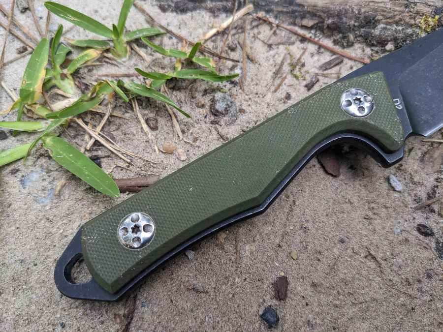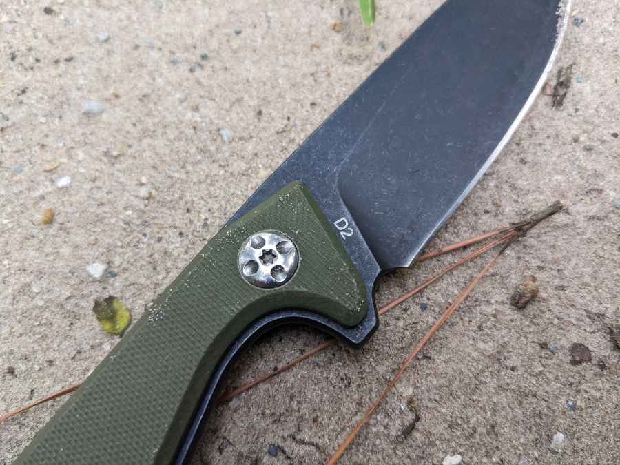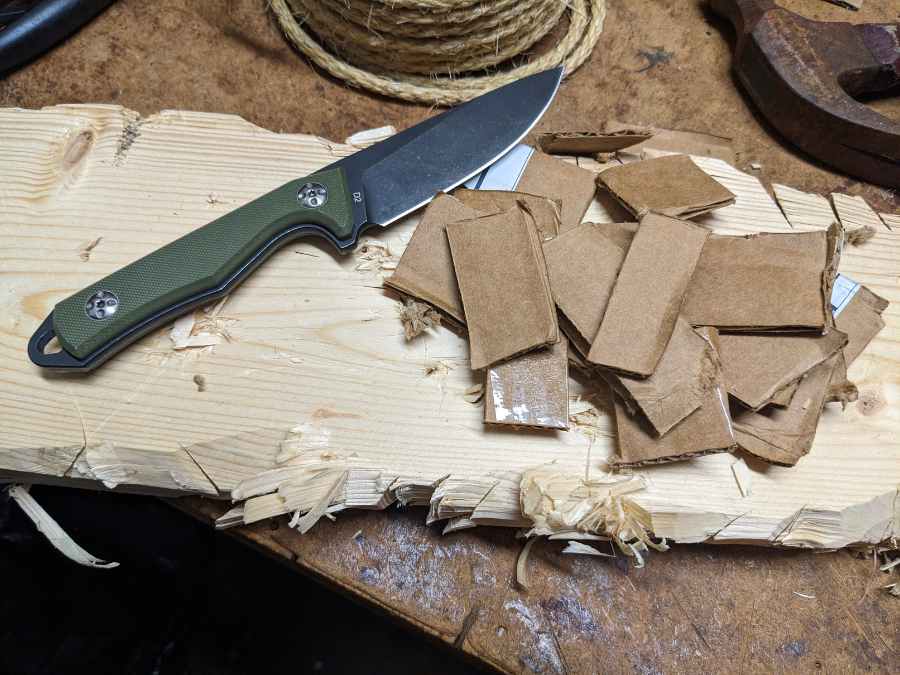 The downside of D2 is that its impact toughness isn’t quite as impressive as its hardness, making it a bit prone to breaking or chipping. As I mentioned above, that makes the sabre grind a good thing, and it helps that this blade is quite thick at the spine.