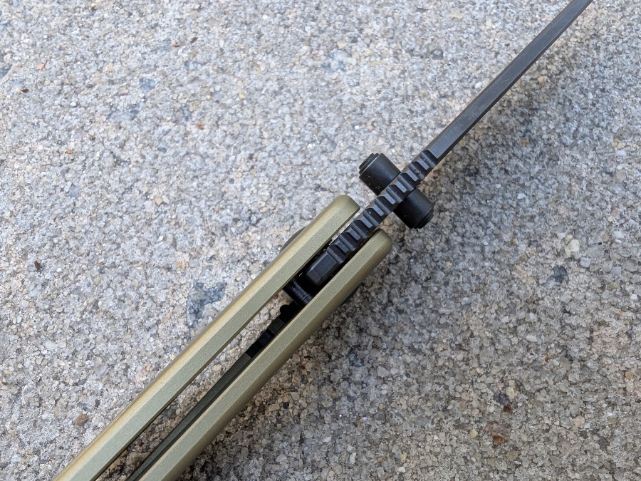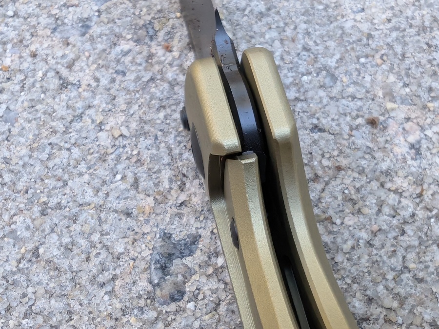 The action is tuned well. The thumb studs are placed where they should be, and the knife fires open with a simple thumb flick or reverse flick. The ceramic bearings give it a smooth, controlled close.