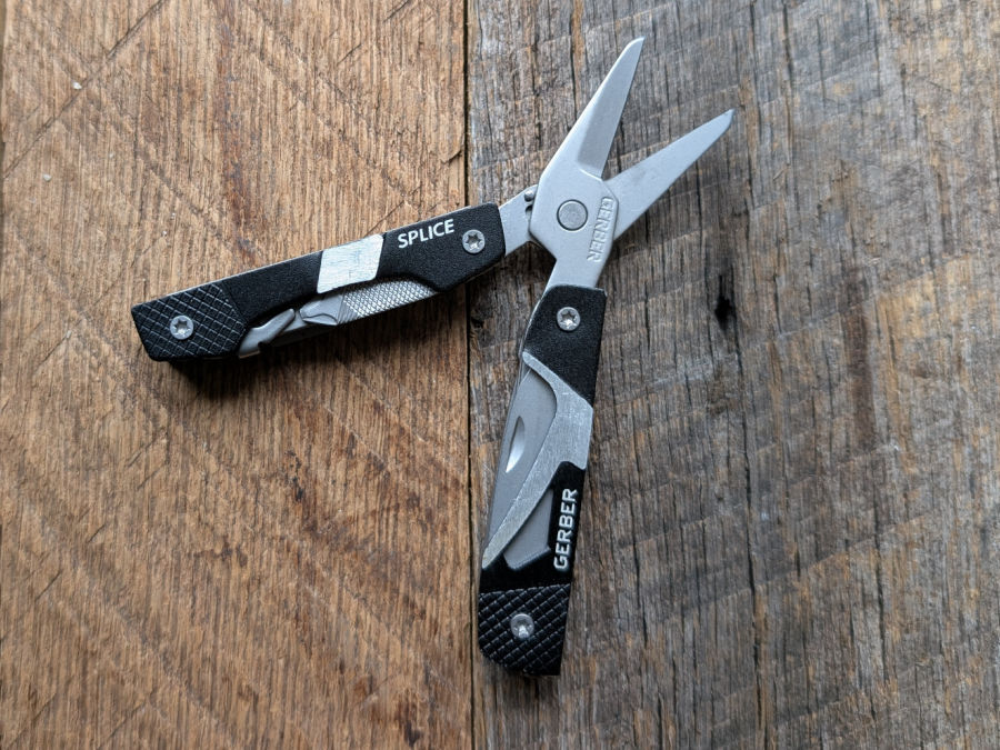 The Gerber Splice is a compact keychain-sized multitool built around a solid set of scissors instead of pliers. It includes a plain blade, a small serrated blade, two flat drivers, a Phillips driver, a file, and a bottle opener, all in a sturdy little frame that rides well in a pocket. Nothing locks, but the tools snap open with enough tension to be usable for everyday tasks.
