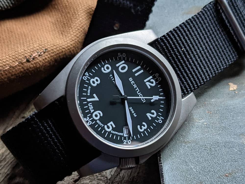 SWC Bunker – The best of all worlds here: titanium, great lume, good movement, and made by guys that love watches. After two years of wearing mine, I can attest to its dependability and how it holds up to wear and tear. Plus, it’s incredibly light so that you really don’t even know it’s on the wrist.
