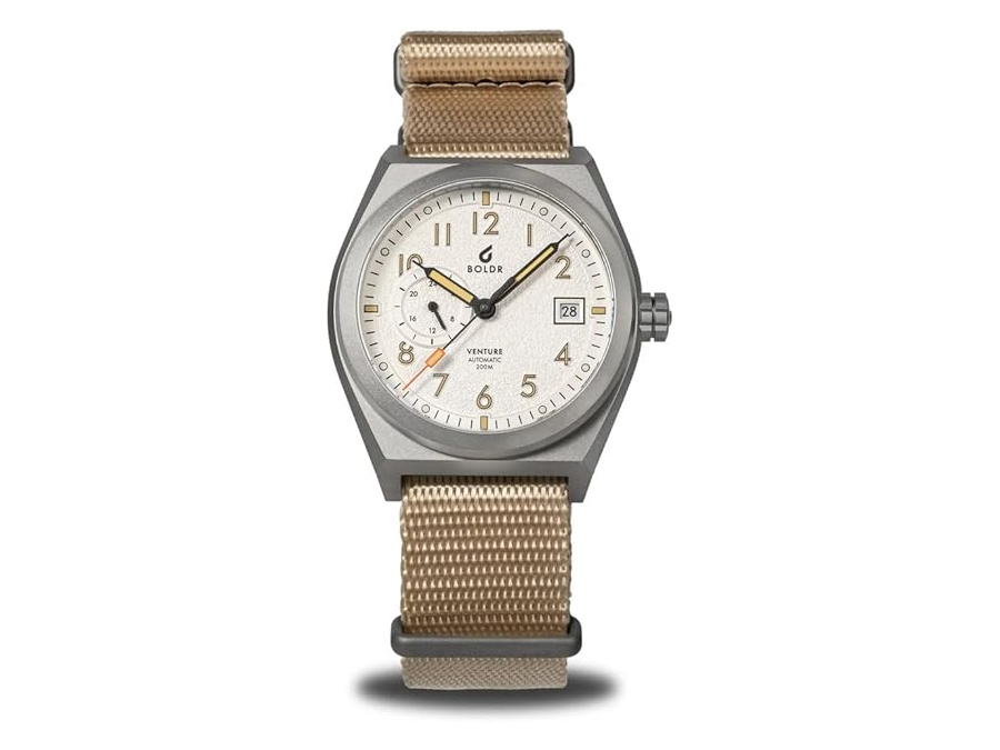 The BOLDR Venture Automatic is what happens when you take a field watch template and upgrade it with material and intention. The full titanium (grade 5) case cuts weight without sacrificing durability. At 38mm across, it wears sharply and compact, with short curved lugs that help it disappear on the wrist.