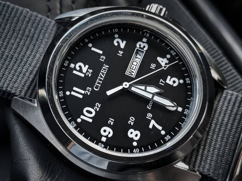 Citizen Garrison AW0050-82E – I have owned this watch for at least 5 years, if not more. It has a classic field watch look with the convenience of solar quartz. A great all-rounder except that the lume is lackluster. For an inexpensive watch the bracelet isn’t horrible and the case and watch are finished very nicely.