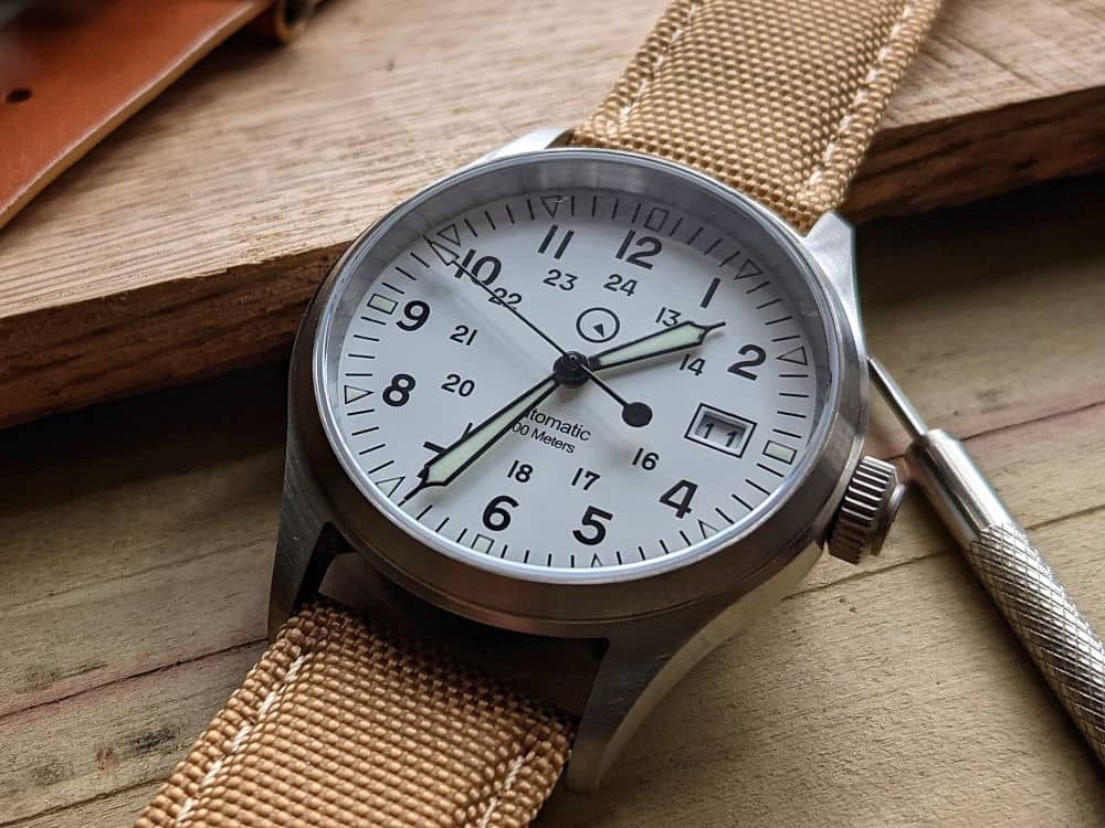 This watch is an outstanding value. If you love the look of a Hamilton Khaki, but want something more reliable, then this could be your watch. Seiko movement inside, solid lume, and a screw down crown…all for $200. What more could you want?