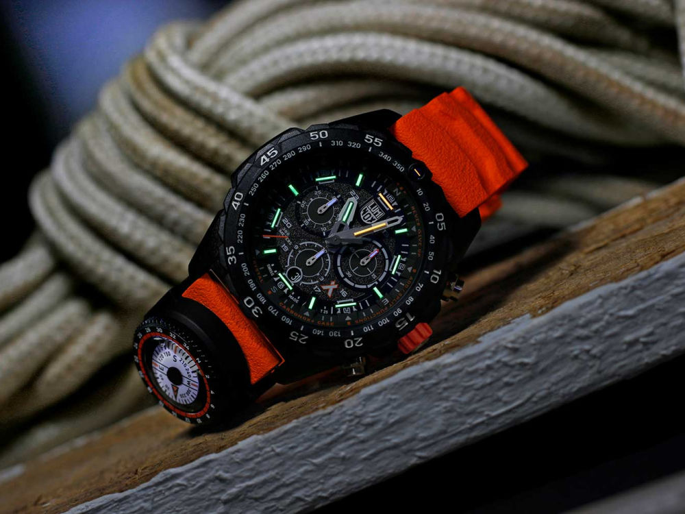 The self-powered tritium illumination — visible 24/7 for up to 25 years — makes it readable in absolute darkness without a button press. At 45mm, it’s bold and rugged, with a white fiberglass case and rubber strap that feel both lightweight and indestructible.