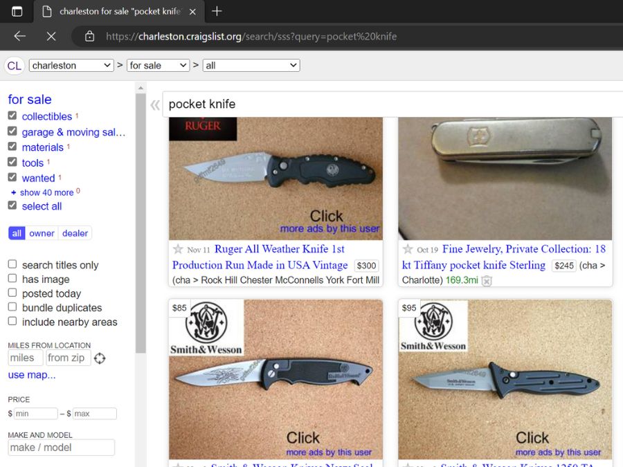 Just about anything you want to buy can be found on Craigslist, but your mileage may vary. The issue with Craigslist is that it’s essentially a mobile flea market; all the problems you can encounter at a swap meet are present here. So yes, you may find a pocket knife, but it could be just as flimsy as one you’d find online, and it’s not going to come with a warrant.